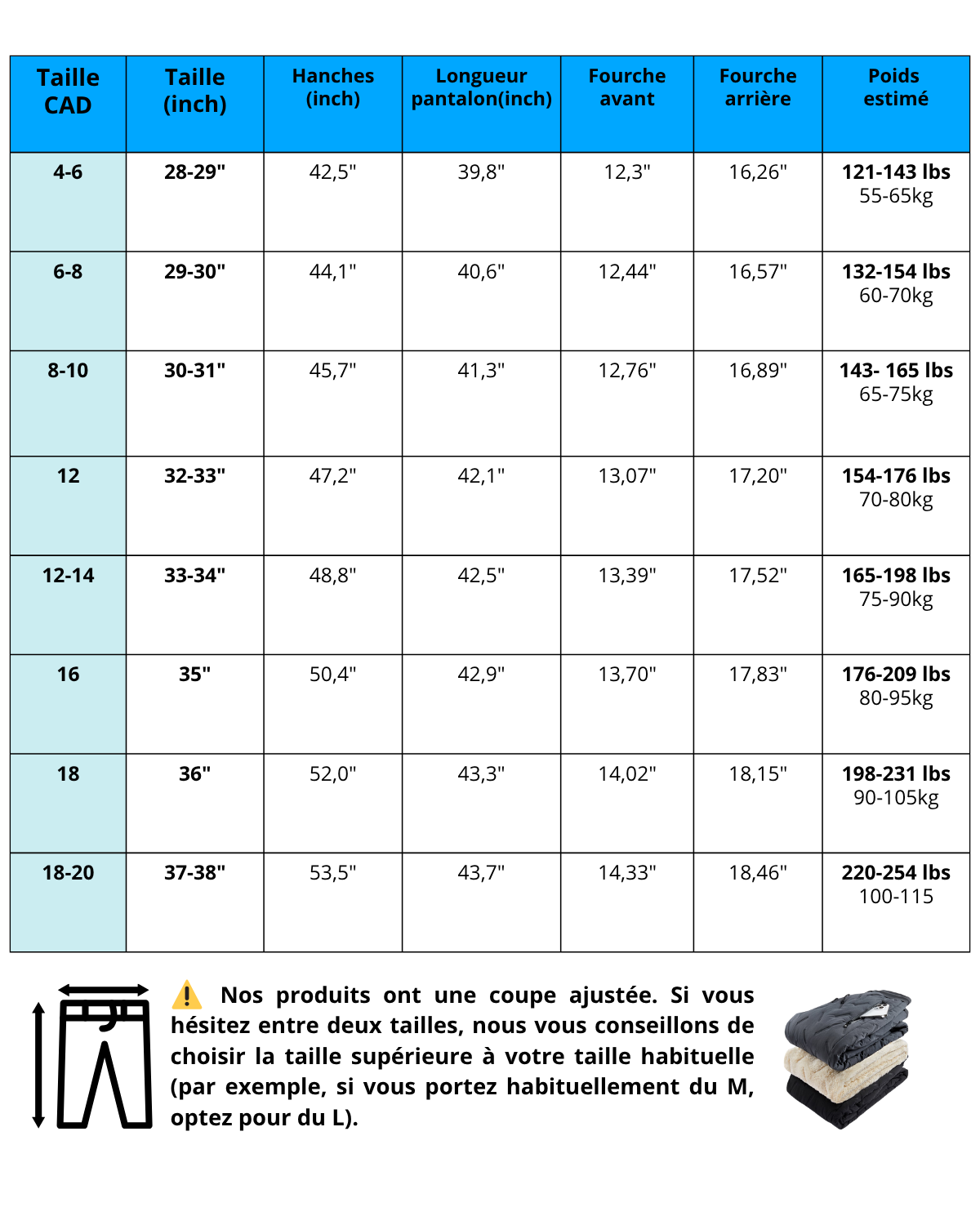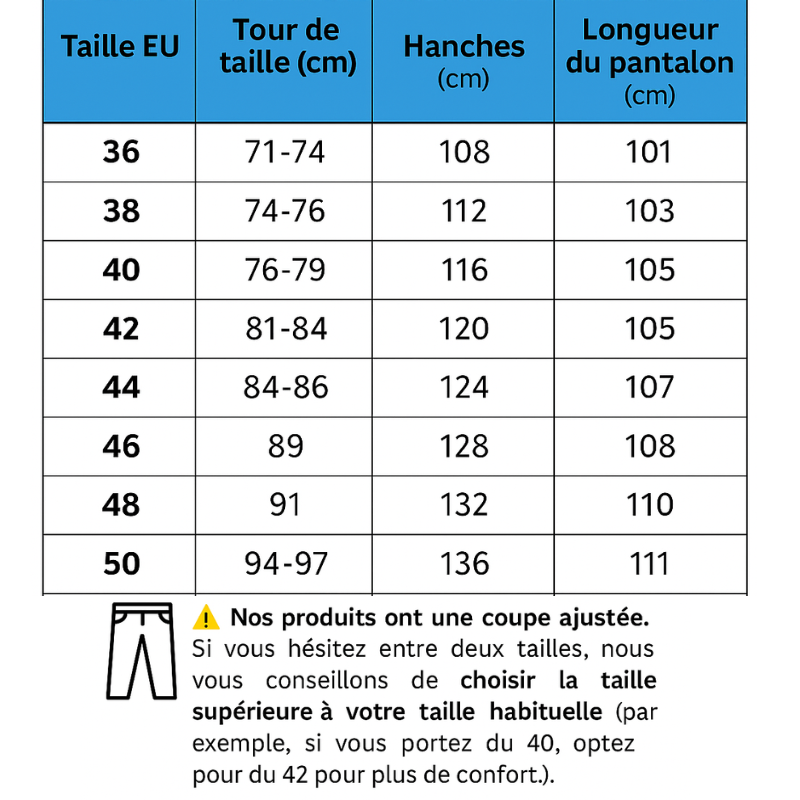 Mesurez votre taille et comparez-la avec les dimensions indiquées.