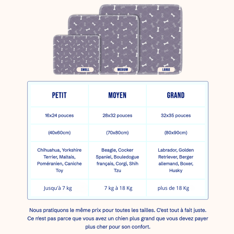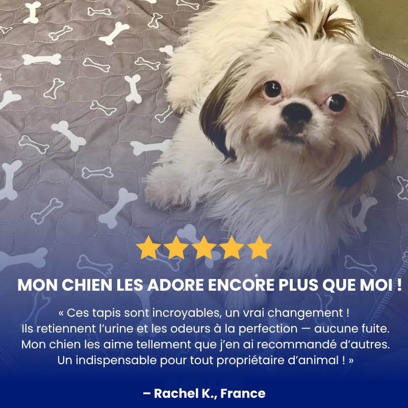 Nous recommandons notre offre de 3 Tapis Toutou™, idéale pour une rotation parfaite et plusieurs emplacements dans la maison.
